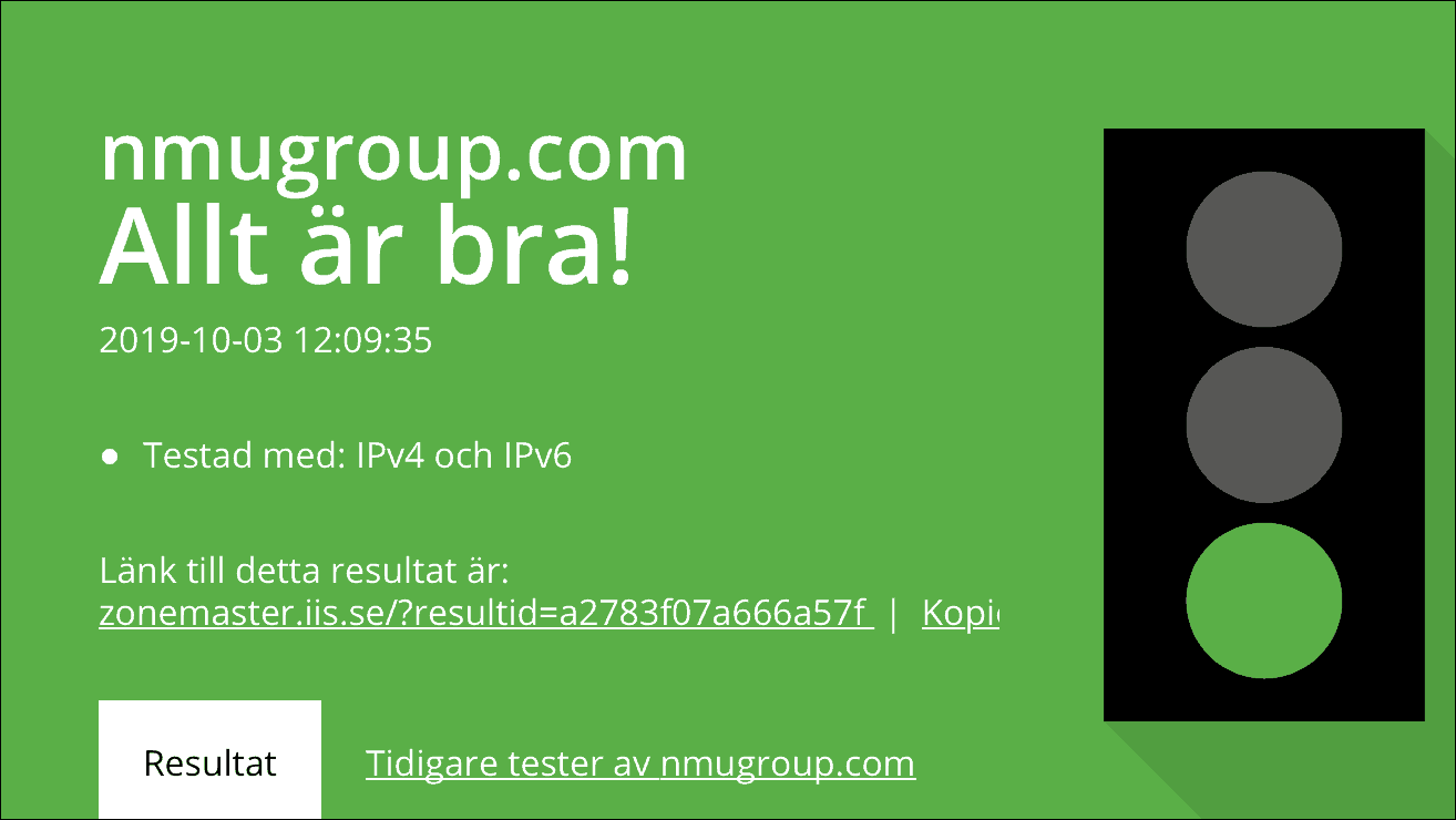 Ett trafikljus avslöjar hur säker era DNSer är. Det bästa resultatet ska se ut som vår hemsida här nedan med grönt ljus.
